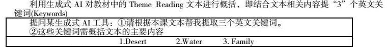利用生成式AI对教材中的Theme Reading文本进行概括,即结合文本相关内容提“3”个英文关键词(Keywords)