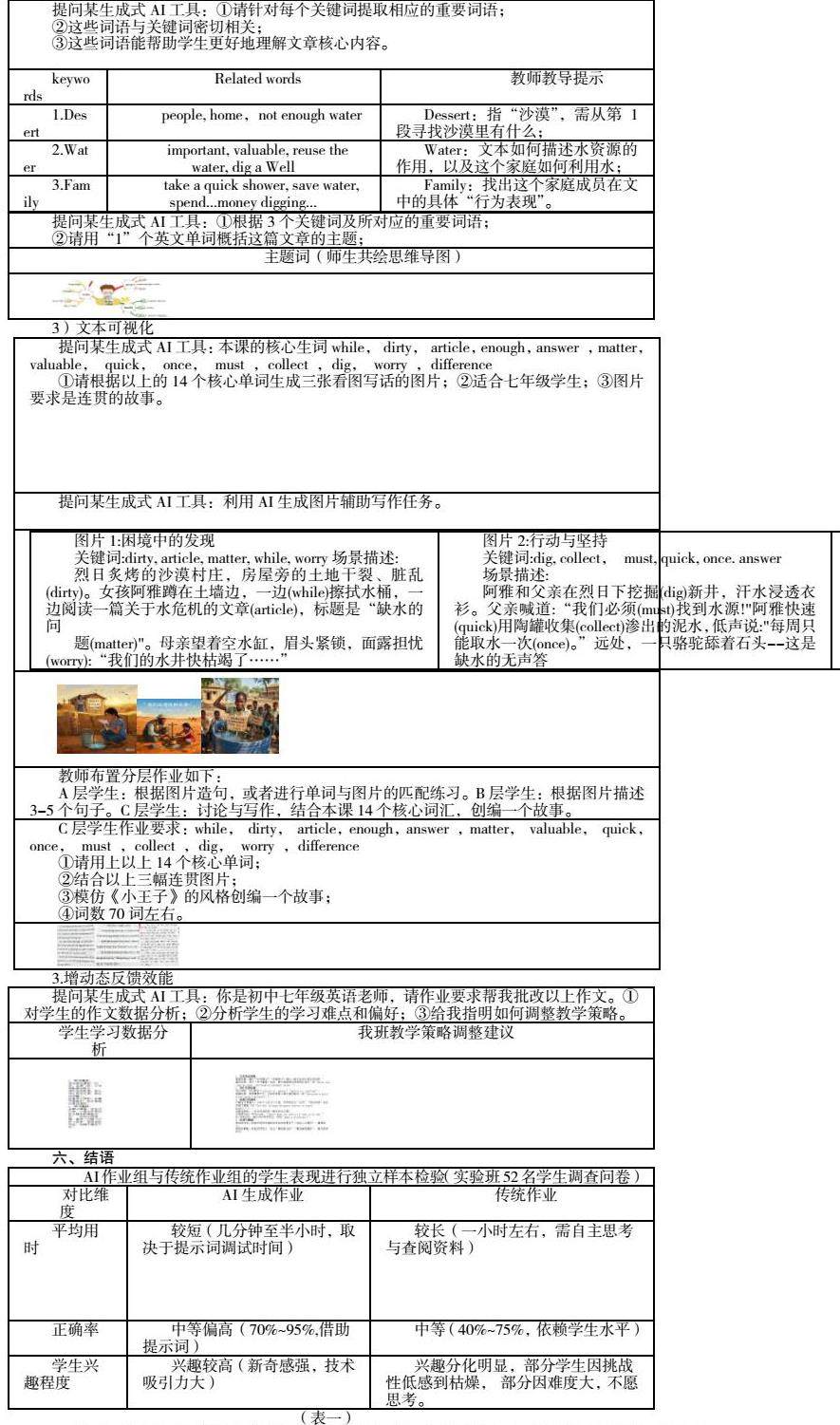 摘 要 基于对义务教育初中英语新教材七年级下册第八单元的梳理,采用行动研究法探讨生成式AI在英语阅读思维型作业中的实践路径。提出AI支持的跨学科任务设计与分层问题链的思考,指向学生高阶思维水平,并为教师提供可复用的“3+1+3”设计框架。研究验证了AI在激活学生认知建构与教师动态干预中的双重价值,为智能技术赋能英语教学改革提供实证支持。