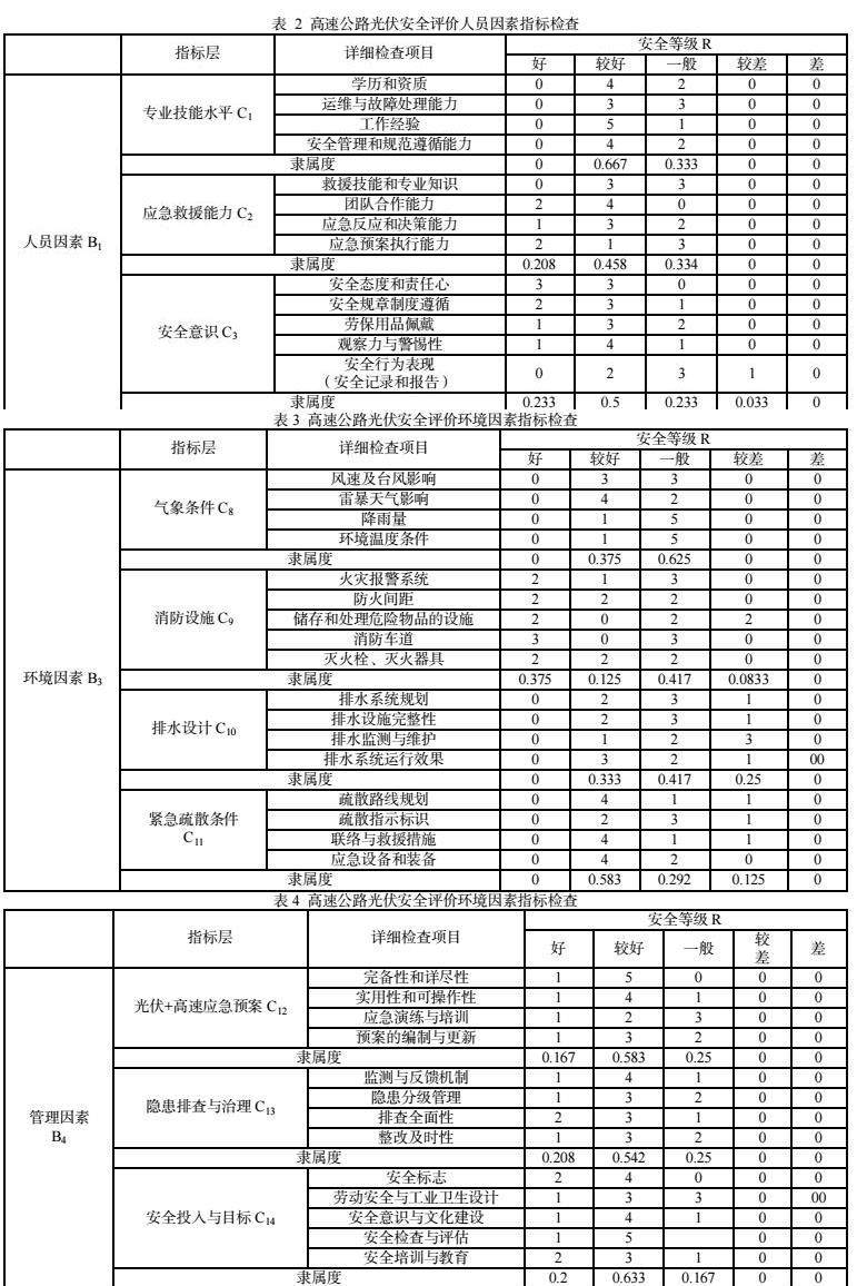 关于高速公路光伏安全评价环境因素和管理因素指标检查如表3和表4所示,排水设计主要从排水系统规划、设施完整性、监测与维护以及运行效果评估。光伏+高速应急预案评估则从完备性和详尽性、实用性和可操作性、应急演练与培训和预案的编制与更新四方面评估。
