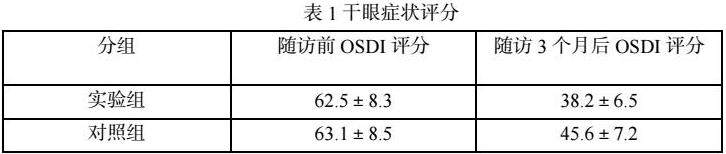 随访前,实验组OSDI评分为(62.5±8.3)分,对照组为(63.1±8.5)分,两组无显著差异(P>0.05)。随访3个月后,实验组OSDI评分降至(38.2±6.5)分,对照组为(45.6±7.2)分,实验组显著低于对照组(P<0.05)。