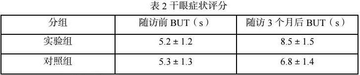 随访前,实验组BUT为(5.2±1.2)秒,对照组为(5.3±1.3)秒,两组无显著差异(P>0.05)。随访3个月后,实验组BUT延长至(8.5±1.5)秒,对照组为(6.8±1.4)秒,实验组显著长于对照组(P<0.05)。
