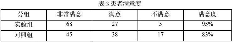 实验组中,非常满意的患者有68例,满意的有27例,不满意的有5例,满意度为95%;对照组中,非常满意的患者有45例,满意的有38例,不满意的有17例,满意度为83%。实验组患者满意度显著高于对照组(P<0.05)。