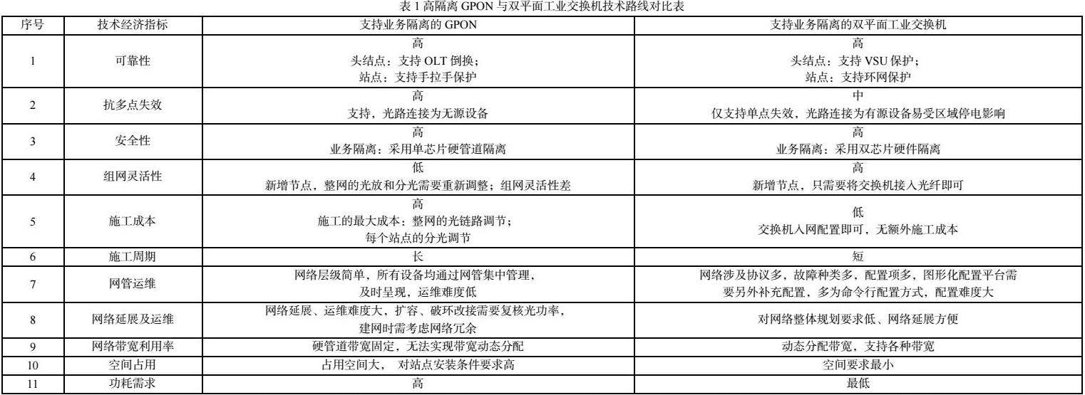 通过上述技术对比,高隔离GPON与双平面工业交换机技术各有优劣,GPON体制在抗多点失效能力、网管运维、物理隔离等方面均优于支持物理隔离的工业以太网交换机方案,工业以太网交换机在组网灵活性、施工成本、施工周期、网络延展及运维、网络带宽利用率、空间占用、功耗需求方面优于高隔离GPON方案,实际可以根据不同区域特点、终端通信接入网发展情况、综合考虑经济性因素选取合适的技术体制。