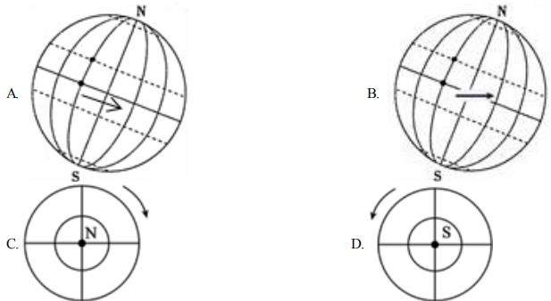 7.运用地球仪演示地球自转现象时,下列地球自转方向绘制正确的( )