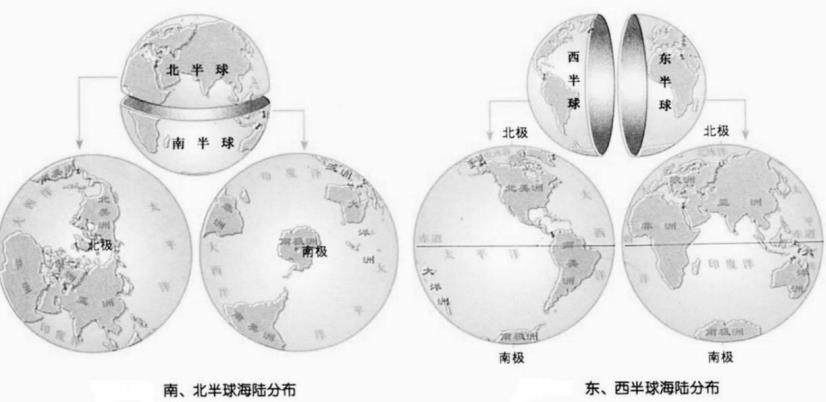 (2)对比南北半球,半球陆地面积更大,对比东西半球,半球陆地面积更大。