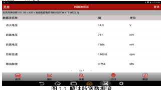 数据分析:在工作运行中如喷油脉宽未达到标准值2 到5ms,数值过小则因为燃油蒸气没有经过计量而燃烧,经过氧传感的测量与反馈使控制器 PCM 减小喷油脉宽来适应空燃比。喷油器、活性炭罐电磁阀关不严产生泄露和油压过高氧传感器故障也会导致数值过小。如果数值过大,则因为有未检测到的空气进入气缸或空气流量计故障失效,则着重检查油压过低、进气量失准、进气管路泄露、氧传感器失灵和点火性能是否下降。喷油脉宽数据流,如图 2-2 所示。