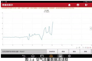 数据分析:空气流量信号出现异常时,会出现加速无力的状态,在汽车怠速状态下对该故障进行检测,怠速状态中进气量低于每秒2g,则可能是因为进气管路泄露造成空气流量的流失或从泄露出流入未检测的空气,如进气量高于每秒 4g,则大多因为空气流量传感器故障造成的信号异常。空气流量数据流读取,如图 2-4 所示。