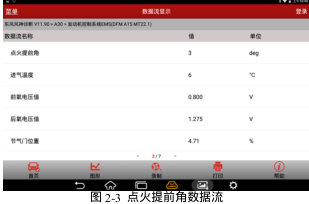 标准值:显示范围,5°到 60°,怠速时在15°上下变化异常值:点火提前角过大或过小。