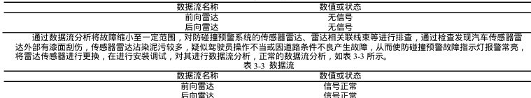 据故障码的显示和故障现象分析,疑点大概率与防碰撞预警雷达与其关联线路相关,用诊断仪器对其进行数据流分析,经数据流读取,无雷达信号,如表3-2 所示。表 3-2 数据流