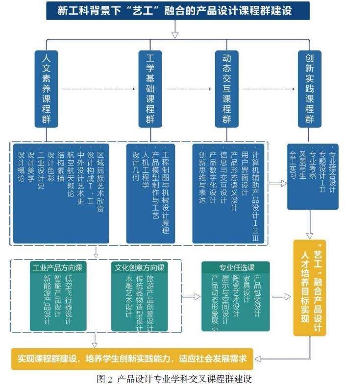 跨学科教育在新工科建设中成为解决传统教 有顽疾重要的途径和手段, “艺工”融合对于产品设计专业的发展至关重要。项目组厘清人才培养目标所需的知识结构,通过课程体系 调整来满足产品设计人才培养目标的需要,科学设置艺术与工学类课程,并按类型组织课程群。“课程群”即按课程的内容的相关性,从培养目标、开课顺序、内容衔接、实践操作、成果展示等层面,将课程组群。解决各学科专业教师互动交流问题,理顺各门课程间的逻辑关系,课程内容由割裂走向有机衔接(如图2 所示)。