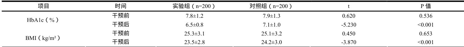 对照组实施常规家庭医生签约服务,包括季度随访、用药指导等。实验组采用"互联网 + 医防融合"管理模式,具体内容如下: ① 数字化管理平台:开发家庭健康档案管理系统,集成电子病历、智能监测(血糖仪自动上传)、用药提醒等功能; ② 分级干预策略:根据病情分级制定个性化管理方案,高危患者启动"医生-专科医生-营养师"联合干预; ③ 家庭健康单元:对签约家庭所有成员进行健康风险评估,开展糖尿病早期筛查与健康教育。