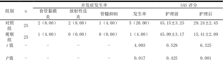 【摘 要】目的:探讨放疗食管癌患者应用基于人文关怀理念下的口腔舒适护理配合心理护理的临床效果。方法:选取 2024 年1 月-2025 年1 月在本院接受放疗的食管癌患者 50 例进行研究,经随机数字表法分组。对照组(25例)应用常规护理,观察组(25 例)基于人文关怀理念上下的口腔舒适护理配合心理护理,分析两组并发症发生率与不良情绪。结果:观察组护理后并发症发生率、焦虑情绪自评量表(SAS)评分低于对照组( (P<0,05) 。结论:放疗食管癌患者应用基于人文关怀理念下的口腔舒适护理配合心理护理,有助于降低并发症发生率,改善不良情绪。