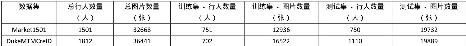 实验在 Market1501 和 DukeMTMCreID 两个主流数据集上进行测试。Market1501 数据集共包含 1501 行人,32668 张图片,其中训练集包含751 行人,12936 张图片,测试集包含 750 行人,19732 张图片;DukeMTMCreID 数据集共包含 1812 行人,36441 张图片,其中训练集包含 702 行人,16522 张图片,测试集包含 1110 行人,19889 张图片。