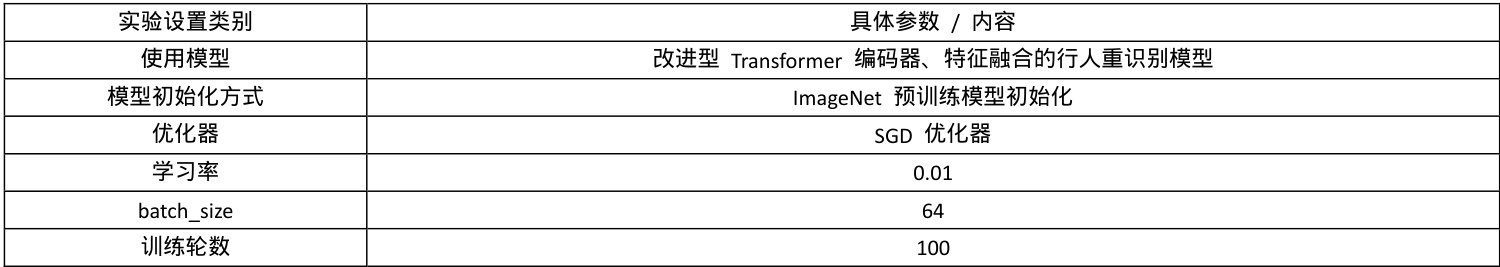 3.2 实验设置实验中使用的模型是改进型Transformer 编码器、特征融合的行人重识别模型,使用ImageNet 预训练模型进行初始化,训练过程中采用SGD优化器,学习率为 0.01,batch_size 为 64,训练轮数为 100。