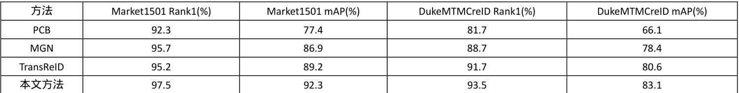 在 Market1501 和 DukeMTMCreID 数据集上,将本文方法与其他一些主流方法进行比较,得到以下实验结果: