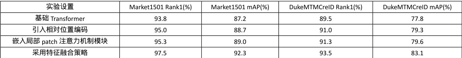 实验显示,引入相对位置编码,模型在Market1501 数据集Rank1 提升 1.2%,mAP 升 1.5% ,在 DukeMTMCreID 数据集 Rank1 和 mAP 均升 1.5% ;嵌入局部 patch 注意力机制模块,Market1501 数据集 Rank1 升 1.5% 、mAP升 1.8% ,DukeMTMCreID 数据集相应指标均升 1.8% ;采用特征融合策略,Market1501 数据集 Rank1 升 2.1% 、mAP 升 2.4% ,DukeMTMCreID 数据集Rank1 升