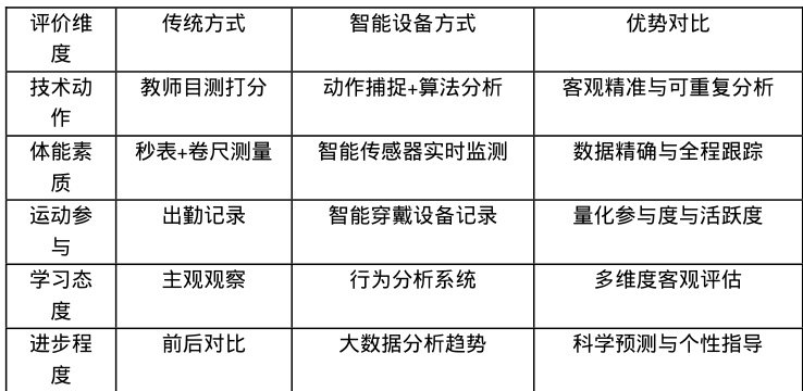 智能设备的广泛应用为体育教学评价体系的创新带来新的机遇与可能,传统的体育教学评价主要依靠教师的主观判断与简单的测量工具存在评价标准不统一及数据不够精确等问题,智能设备的引入使得教学评价更加客观与科学与全面运动传感器可以精确测量学生的运动速度及距离与频率等量化指标,智能摄像系统能够记录与分析学生的技术动作提供详细的动作质量评估报告。可穿戴设备可以持续监测学生的生理反应与运动表现为长期的体能发展评价提供数据支撑,这些技术手段不仅提高评价的准确性与可靠性还实现评价过程的实时化及动态化,学生可以即时获得反馈信息及时调整学习策略,教师也能够基于精确的数据分析为每个学生制定更加科学合理的学习计划(见表1)。