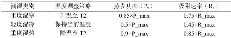 潮湿类别识别完成后,系统需调用与各类别一一对应的差异化除湿策略,其由温度调节参数与除湿执行参数共同构成,前者控制环境温度向正常区间回调,后者根据湿度等级调整除湿设备运行强度与模式。三种潮湿环境在应对手段上存在结构性差异,湿寒状态需执行升温并加大除湿力度,推荐策略为提升温度至 T2 区间并启用高强度除湿参数;湿热状态需降低环境温度至 T2 区间,同样需执行大功率除湿;湿冷状态温度已处于适宜范围,仅需根据其等级选择中等或高强度除湿参数即可。以除湿参数为例,针对“轻度湿寒”所对应的除湿参数设置为 P1 ,重度湿寒设置为 P2 ,满足 P12 ;湿冷对应参数为 P3 与 P4 ,满足 P34 ,且 P1 、P₂、 P5 、 P6 均大于 P3 、 P4 ,从策略角度确保湿寒与湿热场景下除湿强度显著高于湿冷状态。实际执行过程中,除湿方式可分为风扇吹风、蒸发式与吸附式三类,除湿参数分别控制出风量、蒸发器运转频率或吸附速率,如在“重度湿热”状态下,蒸发器功率设为