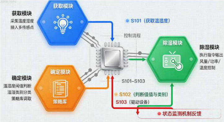 除湿系统的功能实现建立在一套高度集成的模块化架构基础上,系统整体流程包括信息采集、策略识别、决策输出、执行控制四个阶段。在结构上,分为获取模块、确定模块与除湿模块三个核心单元,分别承担数据获取、策略判断与设备执行的关键职责。其中,获取模块负责获取目标空间的当前温度和当前湿度,通常接入多个传感点并具备实时刷新机制;确定模块依据温度与湿度联合判断是否超过预设阈值,并根据已定义温湿度区间判断空间当前所属潮湿类别,进而在策略库中调取匹配的参数组合;除湿模块负责将确定模块输出的除湿策略转化为执行指令,驱动除湿设备进行差异化运行,典型输出内容包括风量设定、蒸发器功率控制与温度调节指令。此外,各模块之间通过通信总线互联,核心控制逻辑由处理器统一调度,内部通信接口支持高速串行协议,保障信息传输稳定(如图 1)。除湿控制中,基于图示流程 S101 至 S103 展开:S101 阶段获取当前温湿度值,S102 阶段判断是否大于阈值且分类对应潮湿类别,S103 阶段驱动除湿设备进行控制,形成闭环。此外,系统内部设有状态监测机制,对执行效果实时反馈并返回控制模块调整参数,提升控制精度。