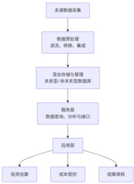 据、异常值与缺失值,例如利用均值填充法补全缺失的建材价格数据;随后开展数据转换,将非结构化的文档、影像数据转化为结构化数据,如通过 OCR 技术提取图纸中的工程量信息;最后实施数据集成,将来自不同渠道的分散数据整合到统一数据集,消除数据冗余,为后续分析应用奠定坚实基础错误!未找到引用源。。