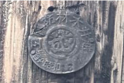 图7:在沈阳铁西区齐贤北街路侧的木质电线杆上发现日本昭和时期生产的金属铭牌