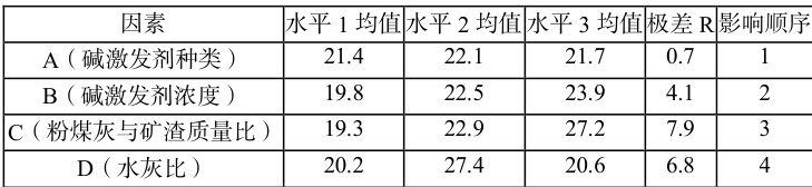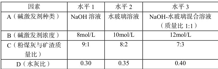 以660MW火电厂粉煤灰为原料制备地质聚合物,通过L₉(3⁴)正交试验可知,各因素对地质聚合物 28d抗压强度影响顺序为碱激发剂种类 :> 碱激发剂浓度
