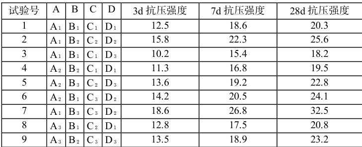 根据前期单因素试验结果,选取影响地质聚合物抗压强度的4 个关键因素:碱激发剂种类(A)、碱激发剂浓度(B)、粉煤灰与矿渣质量比(C)、水灰比(D),每个因素设置 3 个水平,具体如表 1 所示。采用L₉ (34) 正交试验表安排试验,共 9 组试验,每组试验制作 3 个 100mm×100mm×100mm 的试件,标准养护至3d、7d、28d后测定抗压强度,取平均值作为试验结果。