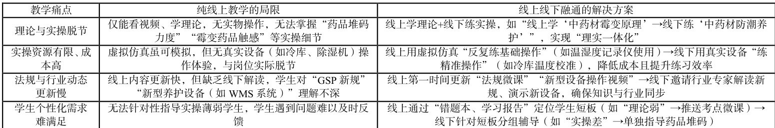 《药品储存与养护》课程核心教学痛点集中在四个方面,但若仅用线上或线下单一模式,会存在难以规避的短板,而线上线下融通模式可精准解决: