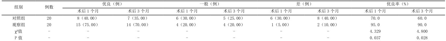 通过康复依从性测量量表,系统评估两组患者术后1 个月、3 个月期间的康复治疗配合程度,量表包含康复依从性等4 个维度共计16 个条目,采用1 至4 级评分制,最终得分最低16 分,最高64 分,康复依从性按总分分为3 个等级:康复依从性优良程度以优良和一般例数之和占总例数的百分比表示。