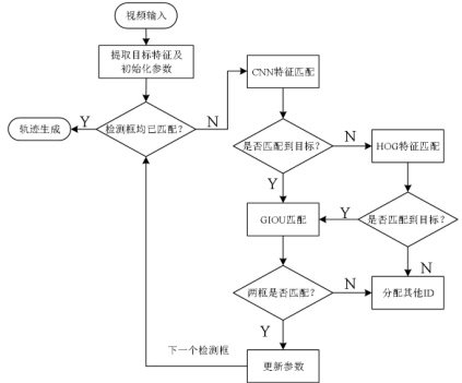 。距离阈值设置为2.5,若距离小于或等于阈值则认为匹配成功,若大于则对目标框内的内容提取HOG 特征,再次通过式(11)的方式进行匹配,此处阈值设置为3.5,如果依旧没有匹配成功,则认为是一条新轨迹,分配不同的ID;如果匹配成功,则和CNN 匹配到的框图一样,通过计算基于广义交并比的代价矩阵对检测框和预测框进行匹配,得到匹配结果。若是全部匹配完成,则使用卡尔曼滤波器更新目标物的下一帧状态。