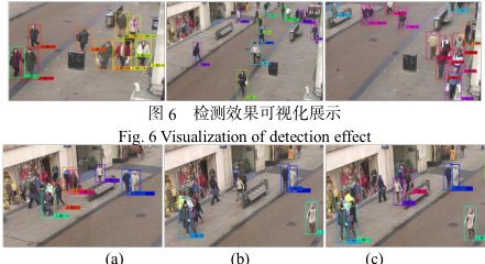 为了进一步直观体现本算法在检测和追踪方面的性能,将部分实验结果以视频截图的形式展示出来。图6 显示了当行人目标在画面中发生重叠,或者多个行人目标相互遮挡的情形,从中可以看出本算法依旧能全部识别各个行人并准确分配各自的ID,同时没有发生漏检和错检的情况,给予行人目标的标注框也可以准确地标注行人。