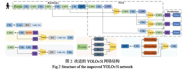 YOLOv5l 模型的基本结构由输入端、Backbone、Neck 和 Head 四部分组成,如图 2 所示,其主干网络为 CSPDarknet53,主要由 CBL 模块和 CSP 模块构成[2]。Neck 部分位于主干网络和 Head 网络的中间,利用它可以进一步提升特征的多样性及鲁棒性。Prediction 部分则由三个大小不同的 Yolo Head构成,将提取的特征转化为预测结果,并输出分类结果和目标的边界框。