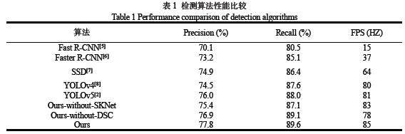 在相同的实验环境及数据集下,分别选取了 Fast R-CNN[5]、Faster R-CNN[6]、SSD[7]、YOLOv4[8]以及YOLOv5[2]等算法作为对比,来证明本算法在行人检测功能上的性能,相关实验结果如表1 所示。对比其他的算法,本算法在精度和召回率上都占优,且得益于使用深度可分离卷积和SKNet,与文献[2]中的 YOLOv5 算法相比,不仅在算法性能上有了一定的提升,而且处理的速度也比基础算法提高了 4.9% ,除此之外,本实验分别对SKNet 和DSC 两个模块分别进行了消融实验,这说明本算法所加入的SKNet 注意力机制可以增强对行人特征的提取,能给模型带来一定的增益;同时证明了本算法,对相关硬件设备的要求也比较低。