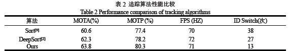 在追踪性能方面的实验上,选取了Sort[9]以及DeepSort[10]作为对比算法,为了体现公平性,都统一使用本文所设计的行人检测网络作为前端的检测工具,且在标准的MOT16 数据集上进行测试。表2 为三个算法的详细实验数据,本算法在经过改进之后,在MOTA 和MOTP 两个实验指标上,相较于其余算法有了较大提升,同时视频的处理速度也几近持平,不增加额外的计算负担。另外,ID Switch的次数明显降低,说明即使目标物特征发生一定的变化,仍可以准确追踪。