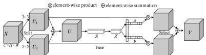 具体来说,给定一个特征 X∈Rc×H×W , C 为特征图通道数, H 和W 分别为高和宽。首先对其做Split 操作,即使用两个大小分别为 3×3 以及 5×5 的卷积核对输入特征进行变换,得到两个新特征U1∈RC×H×W 和 Uz∈Rc×H×W 。