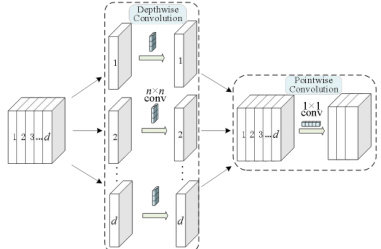 而深度可分离卷积的计算量为: Wc×Hc×W×H×d+W×H×N×d (8)