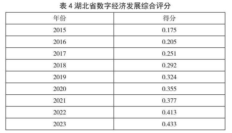 (1)数字化创新日益强劲,数字技术创新应用正成为湖北省引领中部地区崛起的核心引擎。目前,世界范围内正在经历一场更大范围、更深层次的科技革命和产业变革,互联网、大数据、人工智能等数字技术不断突破,数字经济蓬勃发展,成为全球经济增长的新动能。由表4知,信息技术与实体经济加速融合,数字产业化规模不断壮大,产业数字化转型步伐加快,数字经济已经成为驱动湖北省经济高质量发展的核心关键力量。各类数据要素得到较为充分的集聚共享与开发利用,“十四五”时期湖北省数字经济跨越式发展面临前所未有的发展契机。