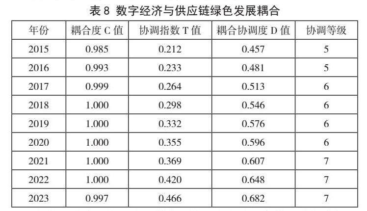 根据耦合度C值反映出数字经济与供应链绿色转型升级有极强的影响关系,且自2015年起数字经济的发展与供应链的协调程度也逐渐提高。深入推进“互联网+流通”,构建线上线下资源融合的全渠道供应链、推动流通新业态的落地发展,构建智慧供应链、推进供应链生态化聚集,提升流通供应链服务水平、推进流通与生产深度融合