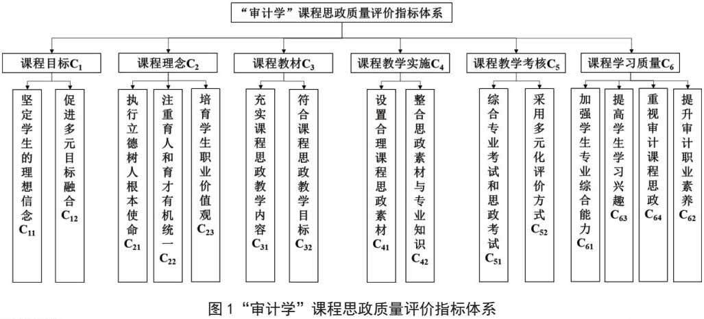 本文在文献2[2]所示的“审计学”课程思政质量评价指标基础上,设计了如图1所示的评价指标体系。