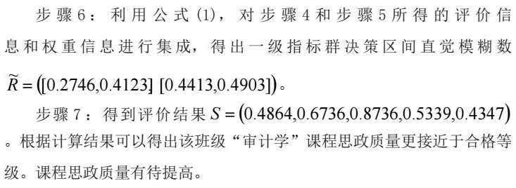 步骤7:得到评价结果。根据计算结果可以得出该班级“审计学”课程思政质量更接近于合格等级。课程思政质量有待提高。