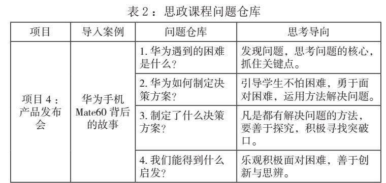 课中的第一部分为公司产品发布会。在开始完成项目前,教师对汇报内容提出要求。展示成熟的评分体系,建立规则意识。课中第二部分,教师通过课前问题库来梳理理论知识。学生团队合作,参与游戏化课堂、提升团队合作与探究能力。第三部分是思政教育部分,教师讲解小米造车解决困难的过程,Su7在参考超越中的创新等,培养不怕困难,积极乐观的心态。通过观看字节跳动CEO在美国国会舌战群儒,弘扬中华民族传统美德的奋斗精神。 第四部分学生正装出席发布会,提升岗位素质。最后教师对学生成果评价总结,深化思政元素融入,强调运用7步法来制定决策方案。