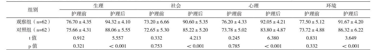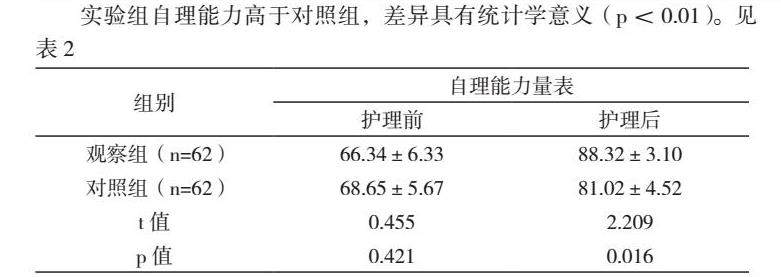 实验组自理能力高于对照组,差异具有统计学意义(p<0.01)。见表2