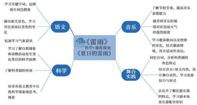 将语文与音乐的内容相融合,2节课连在一起。这对笔者来说是一次挑战,查阅了很多资料,音乐与语文的跨学科教学案例是比较少的。通过尝试,在学科融合和跨学科的教学过程中,让学生从不同的角度去思考,感受了不一样的夏日雷雨。教学上以雷雨这一自然现象的科学性为切入点,利用学生在科学课上学习到的自然天气知识贯穿课的前后,进行学科融合。再从课文和歌曲的自身角度来设计最合适的教学过程。
