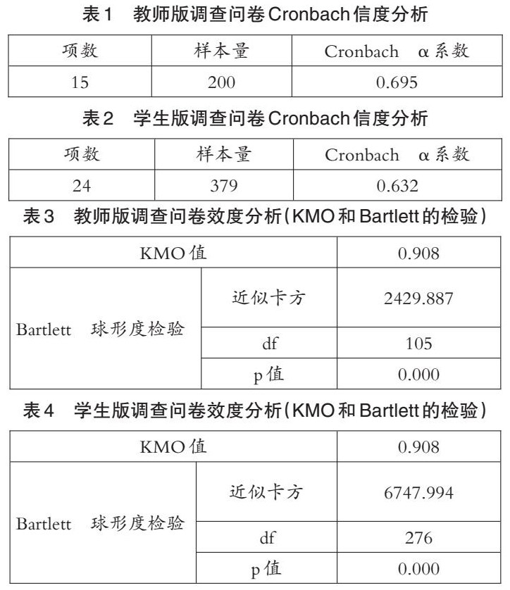在问卷的有效性上,使用统计软件SPSSAU对调查问卷进行有效性分析,使用KMO和Bartlett检验进行效度验证,教师版调查问卷KMO值为0.908,效度分析要求通过Bartlett检验(对应p值要小于0.05)(见表3);学生版调查问卷KMO值为0.908,效度分析要求通过Bartlett检验(对应p值要小于0.05)(见表4)。使用KMO和Bartlett检验进行效度验证,两版调查问卷KMO值均为0.908,KMO值均大于0.8,研究数据效度非常好。