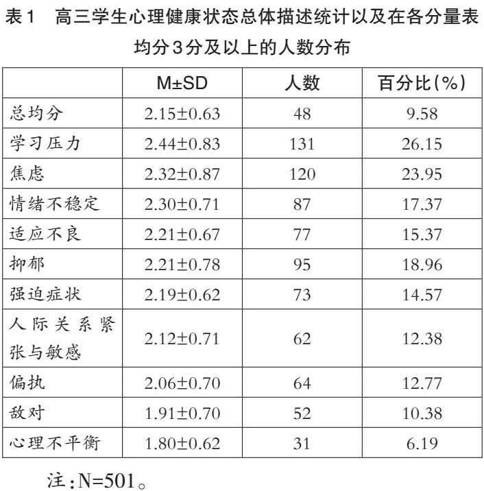 从总均分来看,高三年级学生总体心理健康状态处于中等水平。学生在学习压力、焦虑、情绪不稳定、适应不良和抑郁这五个方面有较重的心理问题(见表1)。高三学生中学习压力均分在3分及以上者的检出率最高,为131人,占总体的26.15%;其次是焦虑、抑郁、情绪不稳定和适应不良,检出率分别是23.95%、18.96%、17.37%和15.37%;心理不平衡检出率最低,为6.19%。