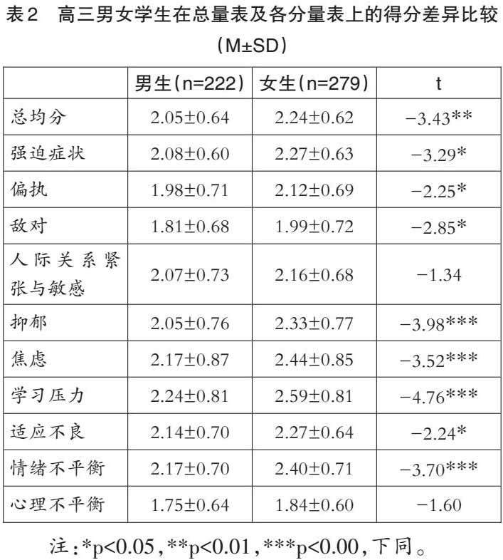 (二)不同性别高三学生心理健康状态差异比较