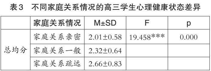 对高三学生的心理健康情况进行以家庭关系情况为自变量的单因素方差分析(见表3)。家庭关系亲密度不同的高三学生在量表总均分上(p<0.05)存在显著差异。根据事后检验结果发现,家庭关系疏远的高三学生其心理健康问题严重程度显著高于家庭关系一般的高三学生,家庭关系一般的高三学生其心理健康问题严重程度则显著高于家庭关系亲密的高三学生。