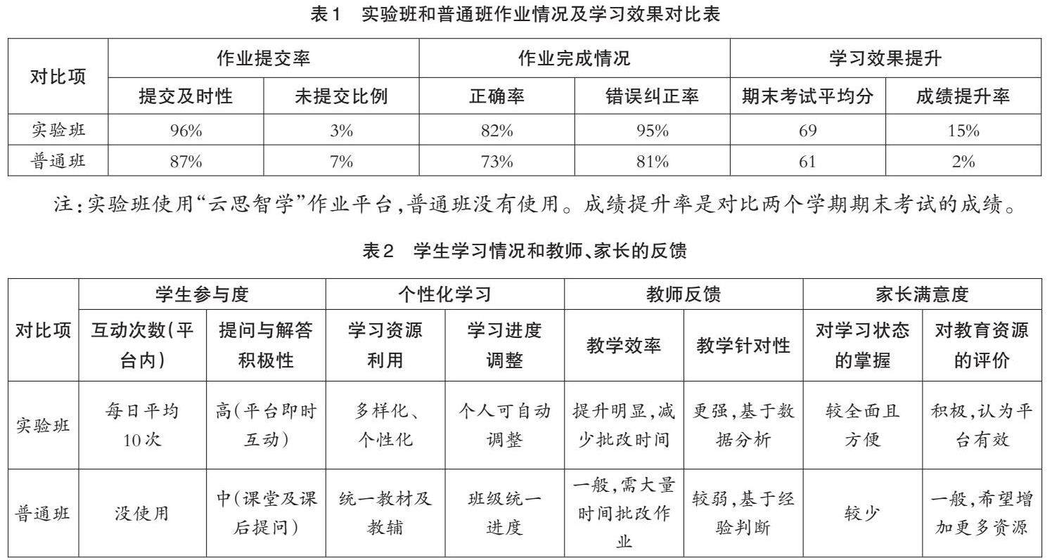 教师将两个班在学习过程中的学生参与度、个性化学习情况、教师教学过程中的教学效率和教学针对性进行对比,将两个班级学生的家长对教师教学情况的满意度和教师反馈情况进行对比,基本情况如表2所示。