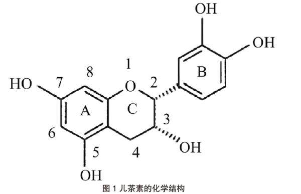 儿茶素的基础结构由一个由两个苯环连接的三环化合物组成,其中包括一个吡喃环(C6-C3-C6结构)。这一结构使得儿茶素具有较高的水溶性和抗氧化能力。儿茶素分子中的两个苯环与一个含氧的吡喃环相结合,形成一个稳定的酚类结构,这使得它具有显著的抗氧化活性。每个儿茶素分子上通常都带有两个或三个羟基基团,赋予了其较强的还原性和清除自由基的能力,这也决定了儿茶素在抗氧化和抗衰老中的作用。儿茶素的化学结构如图1所示。