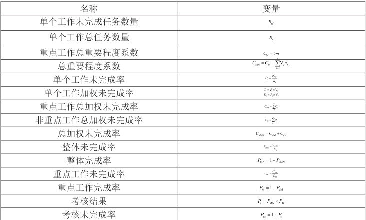假设业务部门共承担 m 个重点工作和 n 个其他工作,各工作的任务完成情况互相独立。将工作按重要程度分为 4 类,引入重要程度系数Vi ,定义Vi ∈[1,2,3,5],规定 Vi =5 的工作为重要工作。为突出重点工作的影响,按照模型假设,规定考核结果为整体工作完成率与重点工作任务完成率之积。